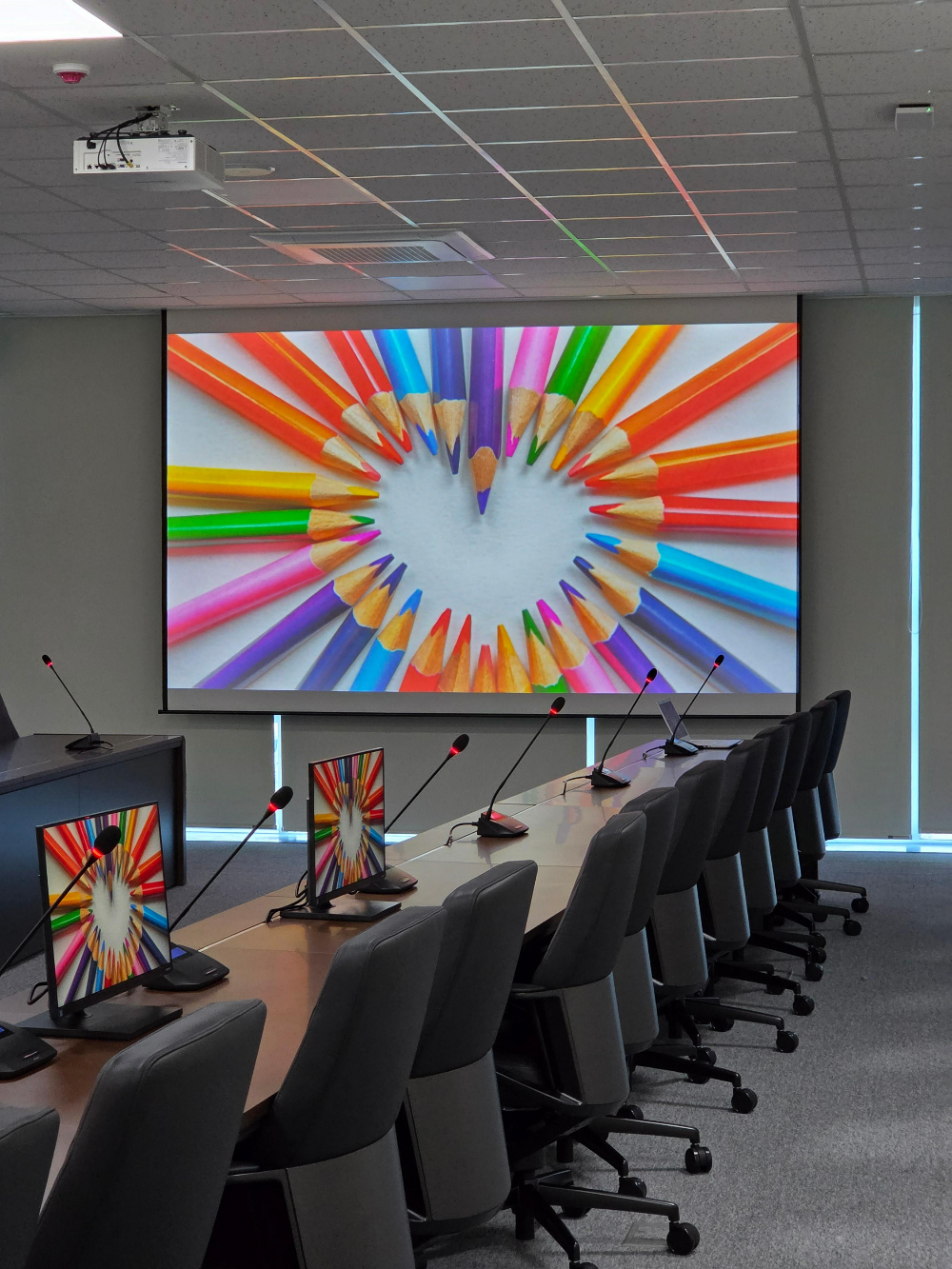 위와 같이 설치된 회의용 마이크 음향 시스템은 기존에 설치된 프로젝터, 스크린과 연동하여 훌륭한 스마트 회의실로 완성됩니다.