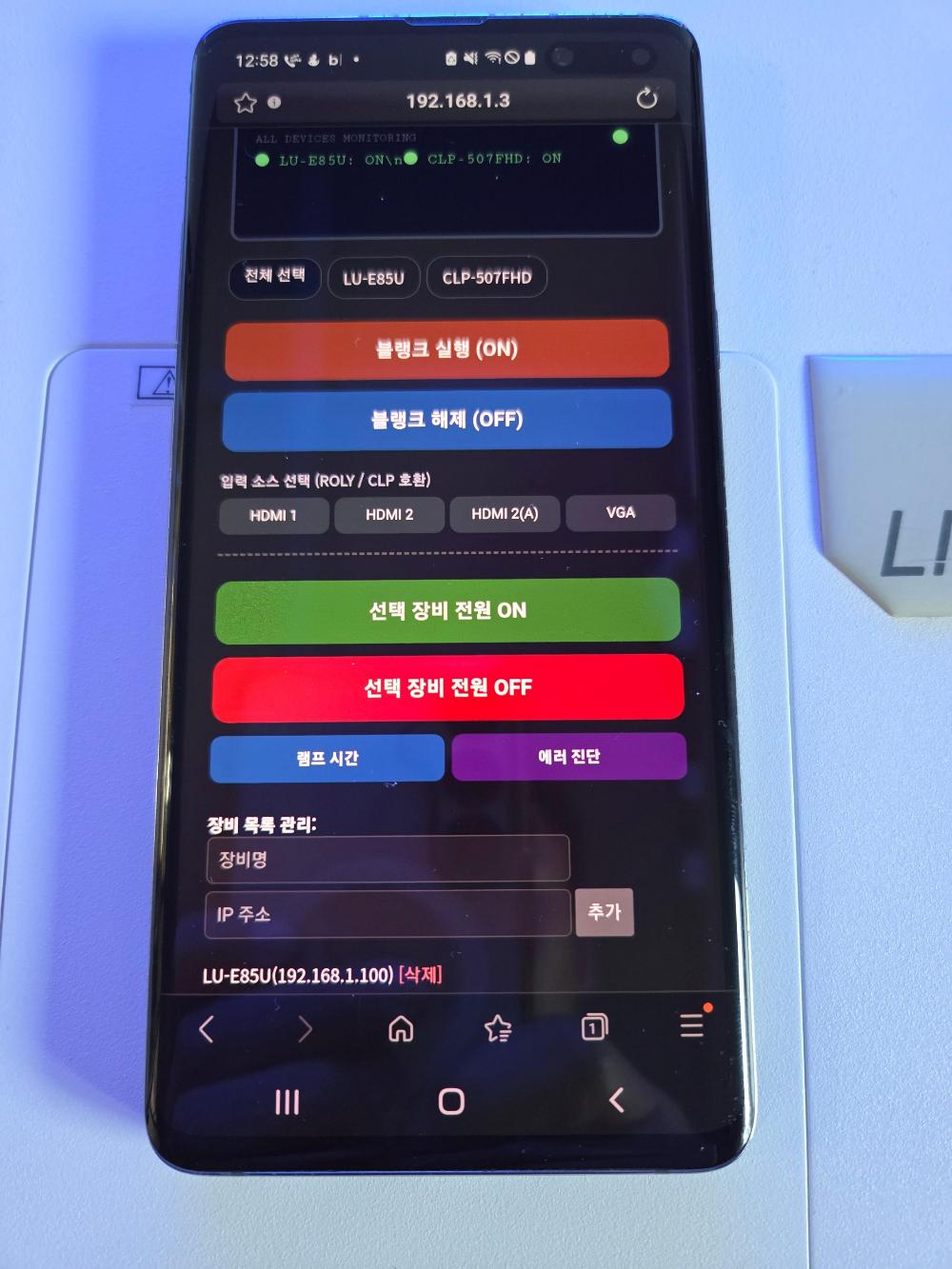 - 제어할 프로젝터 IP주소 등록 및 삭제 기능 사용