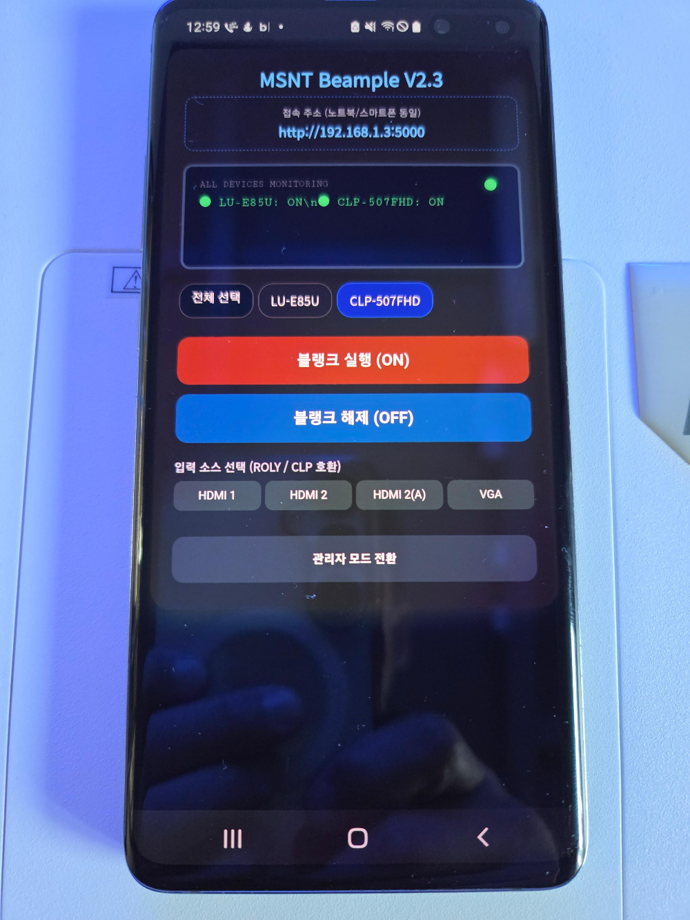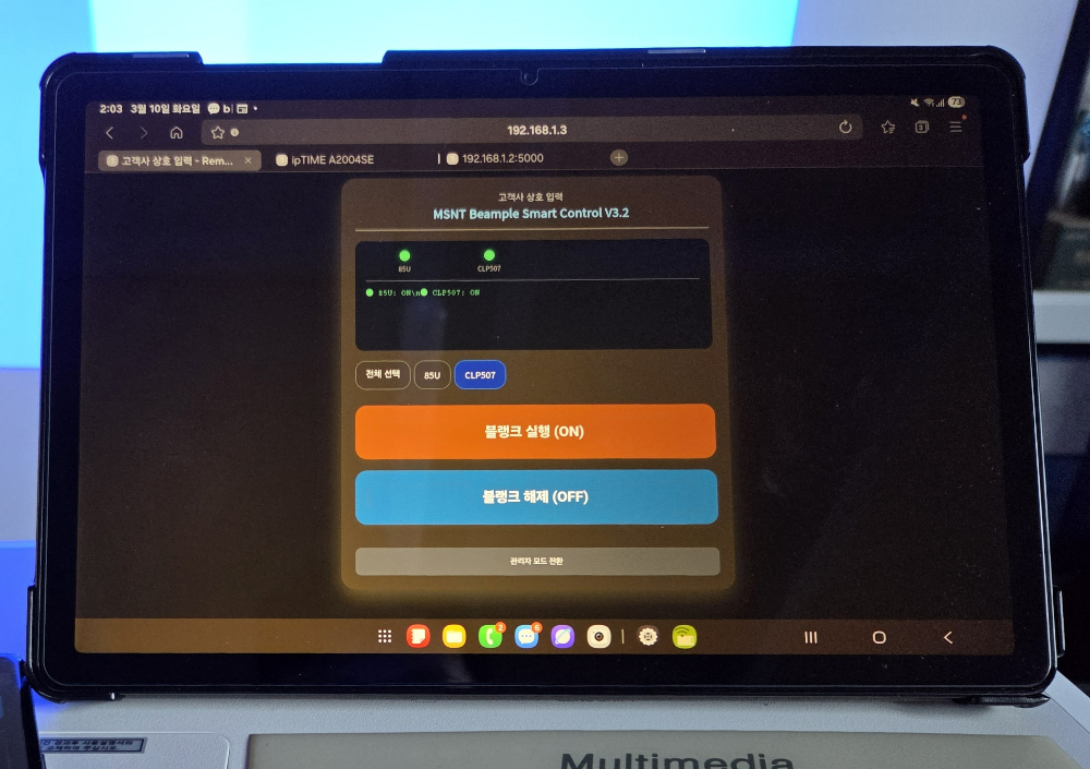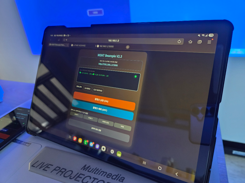 제어PC는 빔프로젝터로 영상이나 PPT자료를 전송하는데 사용하고 같은 네트워크에 연결된 테블릿이나 스마트폰으로 Blank기능을 사용가능한데요.