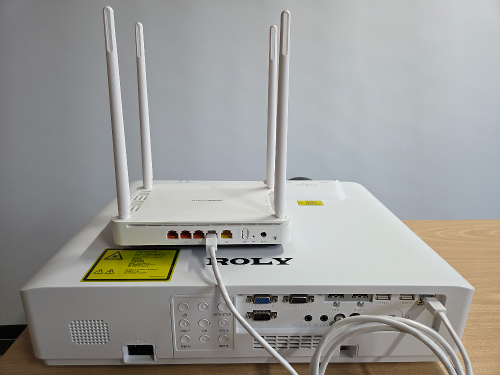 - 프로젝터가 설치된 공간에 와이파이 공유기가 있다면 기존 공유기와 프로젝터를 랜선으로 연결
