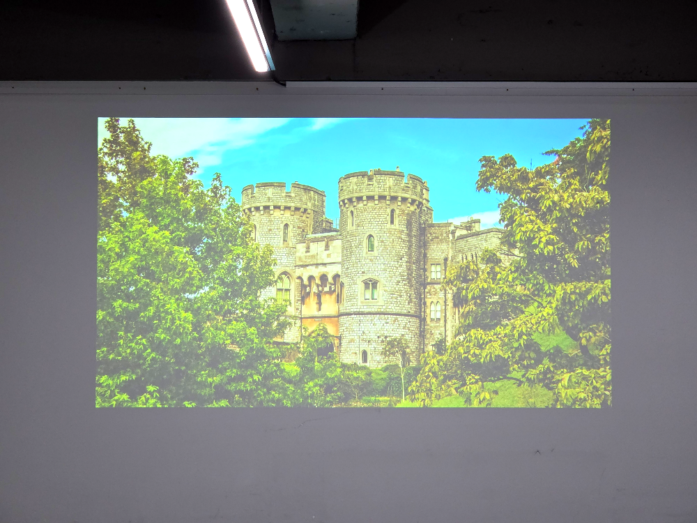프로젝터 설치 완료 후 벽면에 투사되는 100인치 정도의 화면입니다.