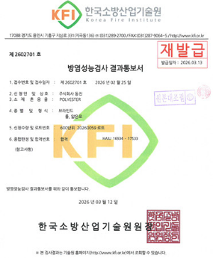 국내 유일 소방인증기관인 한국소방산업기술원에서 인증받은 방염원단임을 확인하고 방염필증과 방염스티커까지 확인했습니다. 안전은 타협의 대상이 아니니까요.